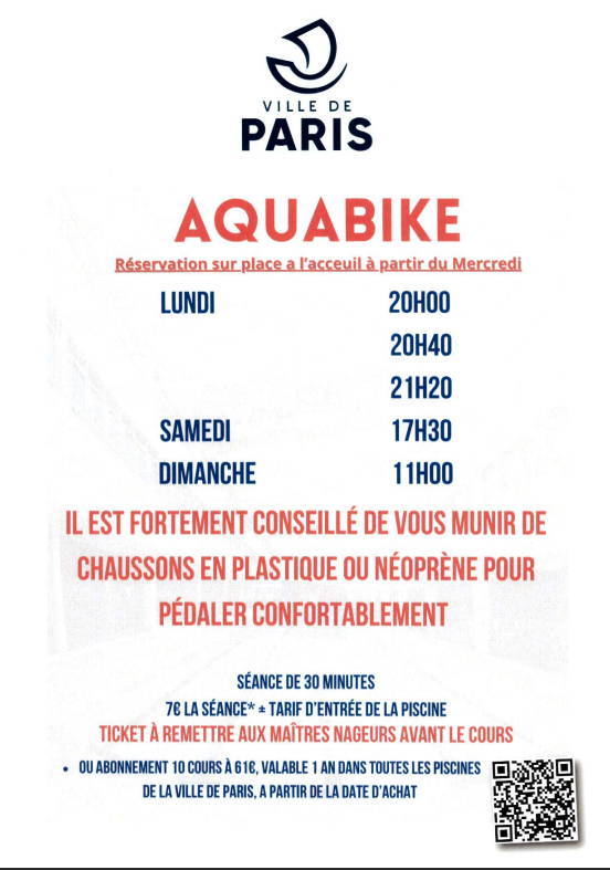 Conseilles pratiques: il est fortement conseillé de se munir de chausson en plastique ou en néoprène pour pédaler confortablement, et d'une bouteille d'eau pour s'hydrater durant le cours.