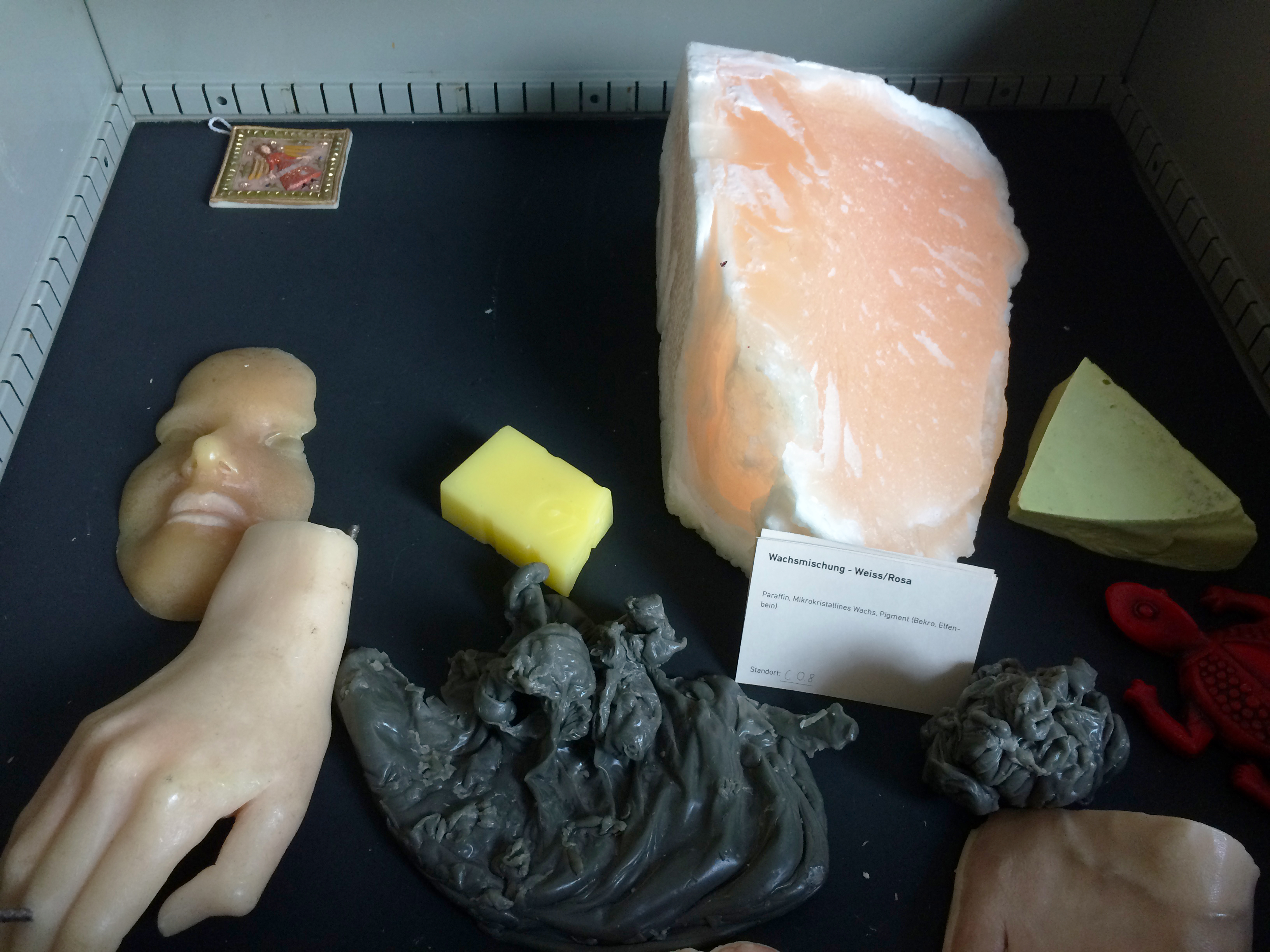 L’intérieure d’un tiroir de la matériauthèque de la Fondation Sitterwerk (CH) contenant plusieurs sortes de cires et paraffines.