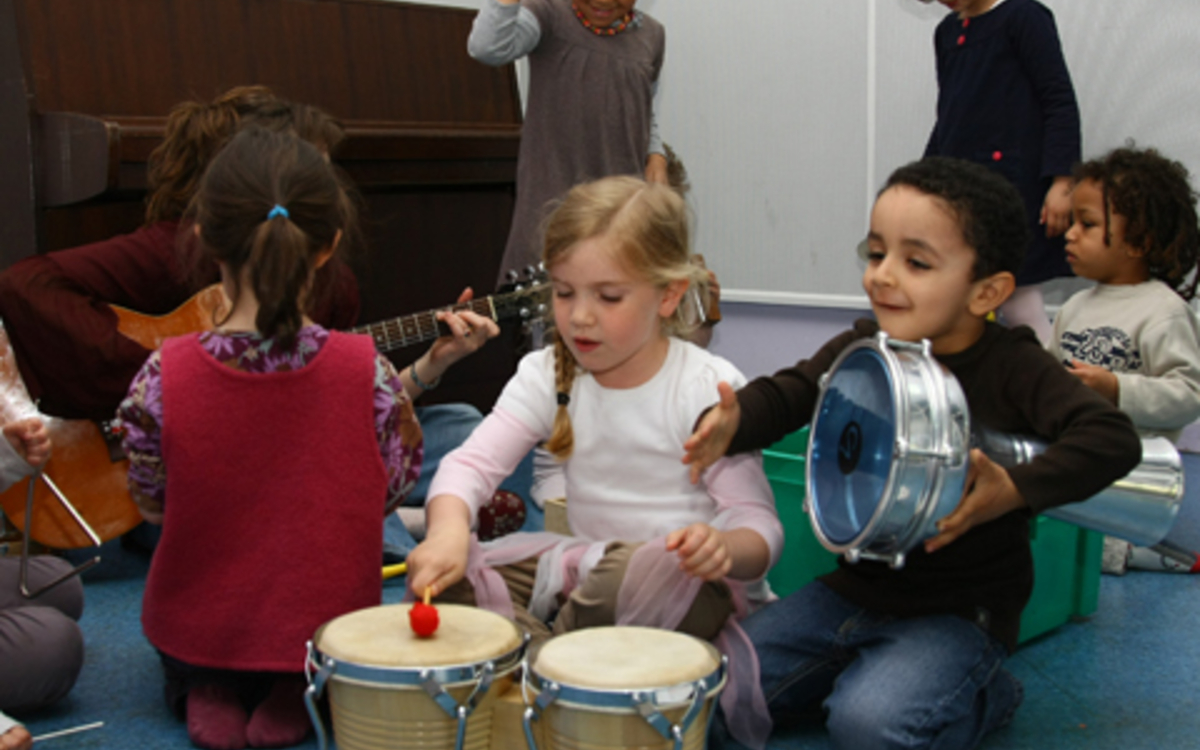 - l'acquisition des premières notions musicales (fort/faible, lent/rapide, aigu/grave…) par l'expression corporelle et la manipulation d'instruments