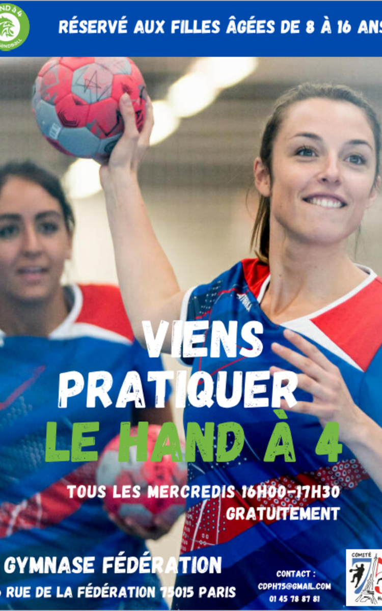 Découverte du HAND à 4 à destination des FILLES dès 8 ans, les mercredis de 16 à 17h30 au gymnase Fédération. Activité gratuite.