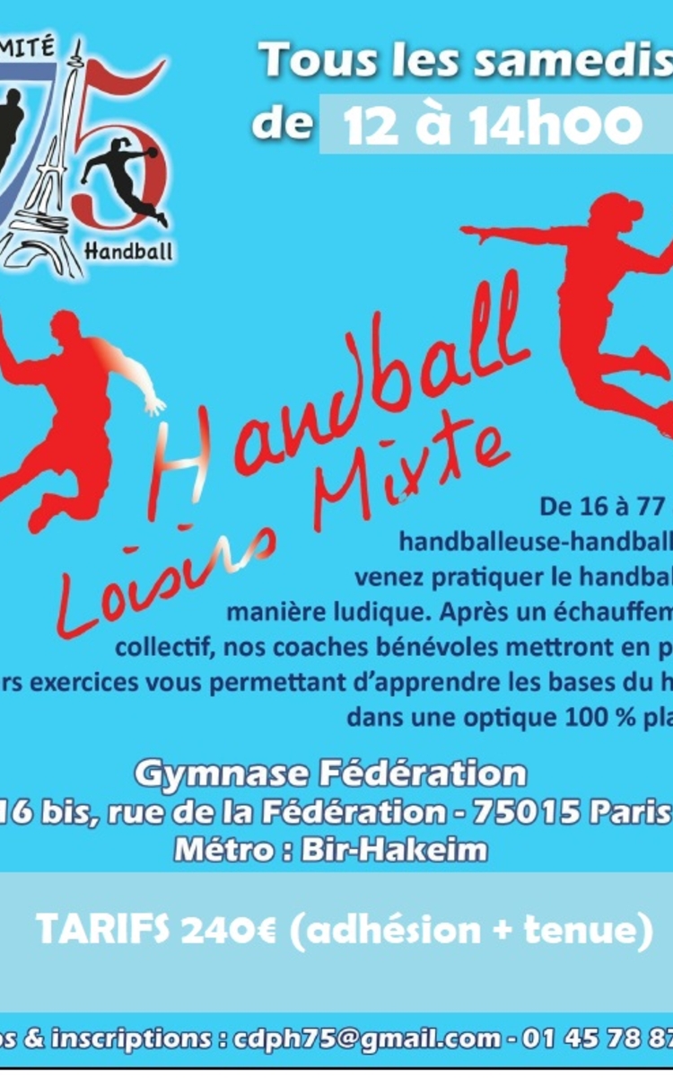 Pratique du Handball en loisir ouverte aux débutants et aux initiés les samedis de 12 à 14h00 gymnase Fédération