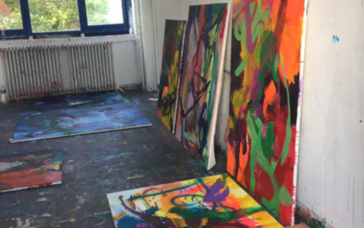 Sur des toiles de grands formats montés sur châssis et posées à même le sol, les élèves sont invités à se familiariser avec les outils du langage abstrait : tâches, signes, aplats…