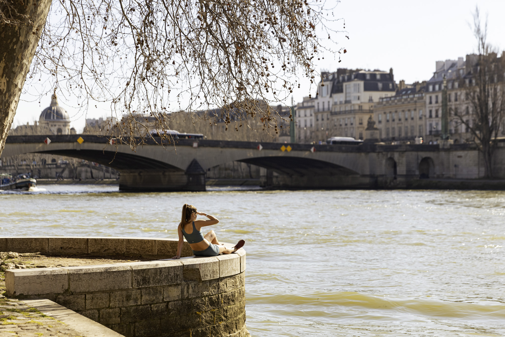 Une joggeuse se repose au soleil, sur les rives de Seine.