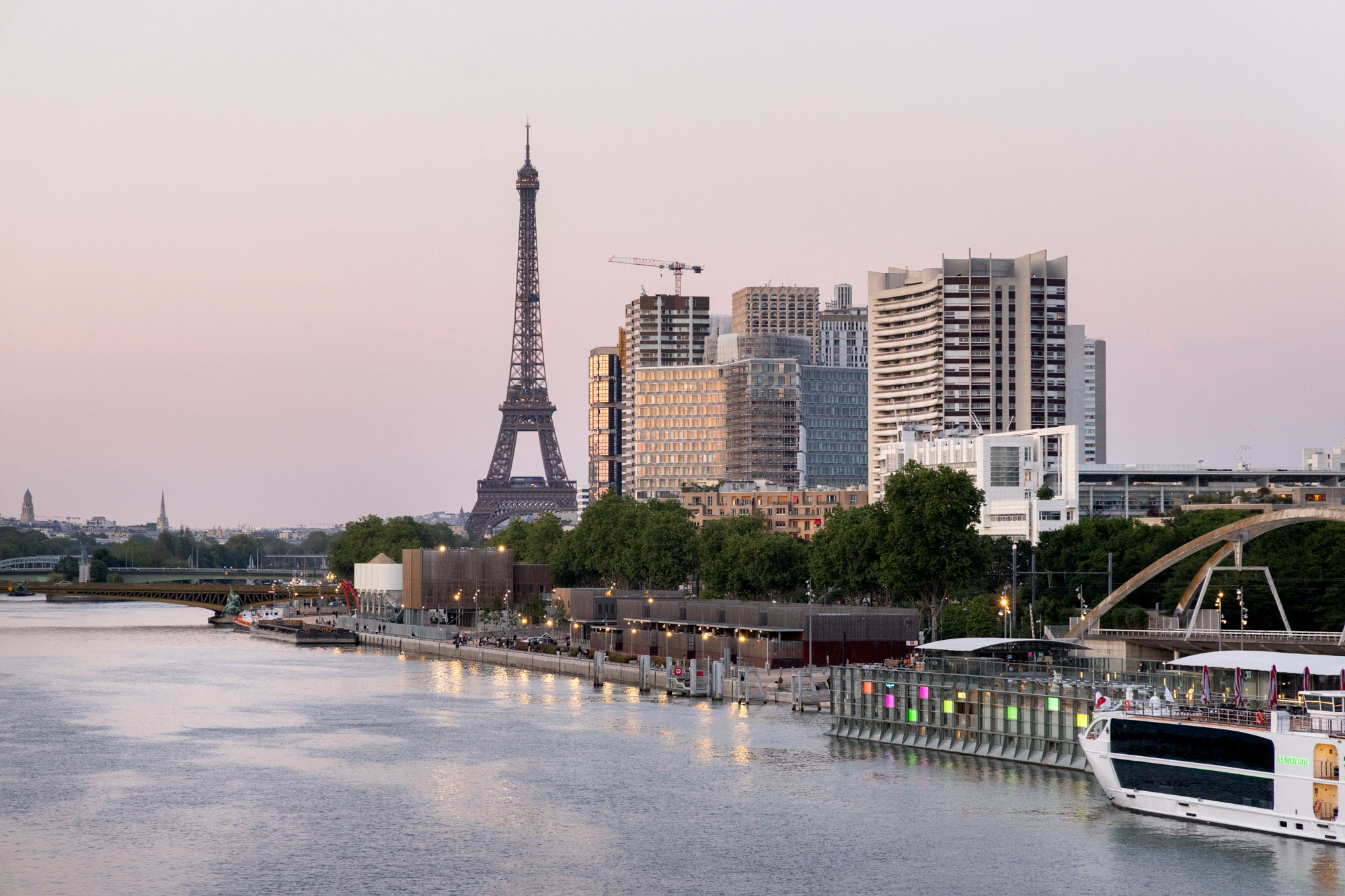 Vue depuis la rive droite sur le quartier de Beaugrenelle (15e) et la tour Eiffel.