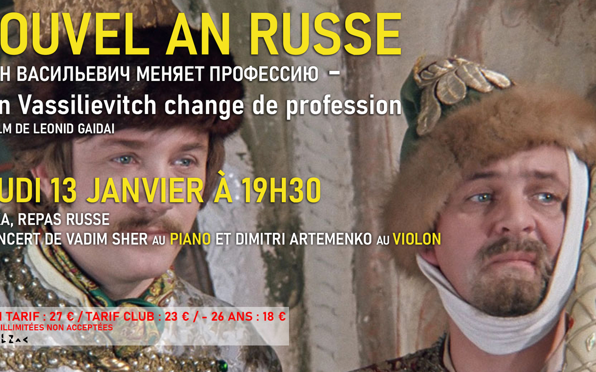 Au programme la (re) découverte du cultissime et excentrique IVAN VASSILIEVITCH CHANGE DE PROFESSION de Leonid Gaïdaï, une comédie populaire vue par plus de 60 millions de russes lors de sa sortie en 1973, suivi d’un concert avec une dégustation de spécialités russes (vodka et pirojkis vous attendent !)