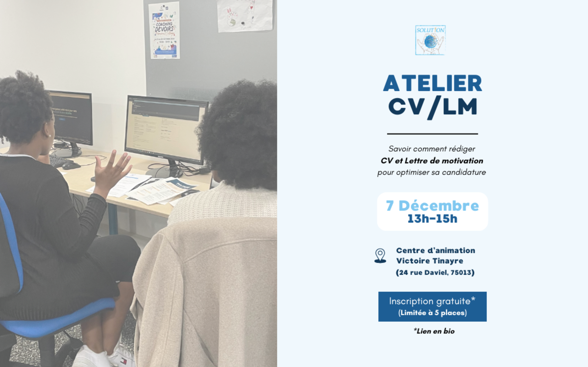 Rendez-vous le 7 décembre de 13h à 15h, au centre Victoire Tinayre, où nous vous aiderons à savoir tout ce qu’il faut pour un bon CV et qui optimisera vos candidatures