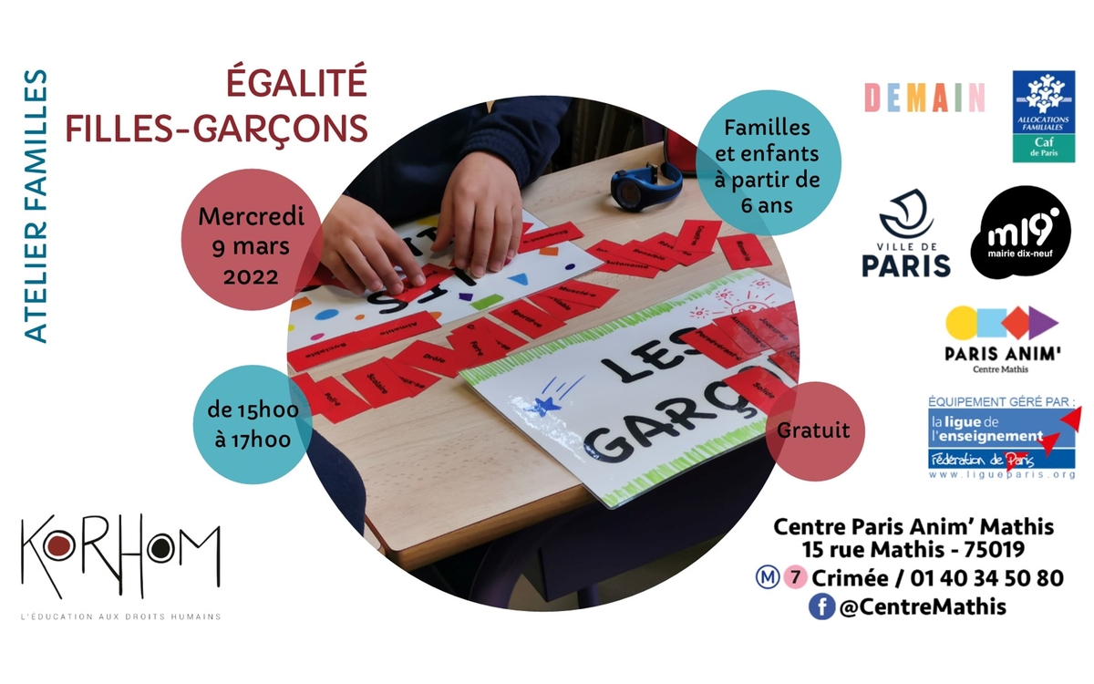 Korhom vous accueille au Centre Paris Anim' Mathis mercredi 9 mars de 15h à 17h pour un atelier familles autour de l'égalité.