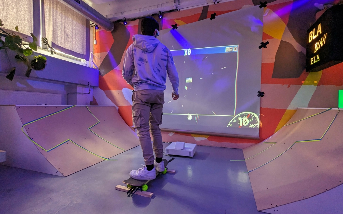 Crashboard est un jeu contrôlé par un véritable skateboard. Plongez en trois dimensions dans le cyberespace grâce à des lunettes anaglyphes et évitez les vagues de bug qui défilent vers vous grâce à vos talents de skateur !