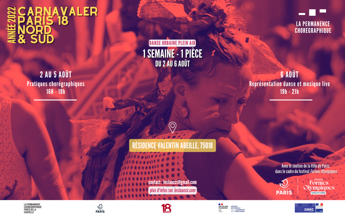 Découvrez des lieux insolites de Paris 18 et les performances artistiques “CARNAVALER” de la chorégraphe Laetitia Angot et des artistes et habitants qui font et vivent La Permanence Chorégraphique Porte de La Chapelle. Venez les rencontrer et si vous le souhaitez participer ! Passer, regarder, venir écrire, photographier ou lire avec nous c’est toujours déjà danser !
