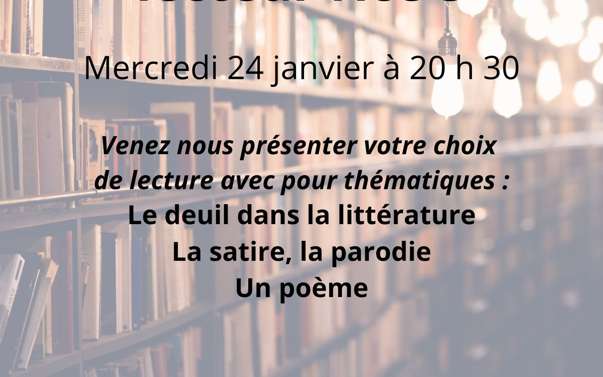 Le Cercle des lecteur·rice·s recommence au Centre Paris Anim' Montparnasse le mercredi 24 janvier à 20 h 30. Venez nous présenter votre choix de lecture avec pour thématiques : Le deuil dans la littérature ; La satire, la parodie ; Un poème.
