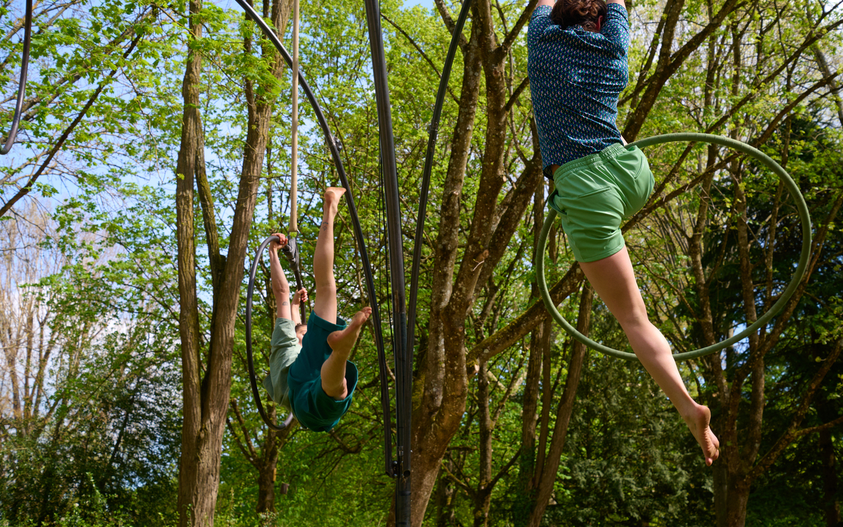Un spectacle de voltige aérienne de la compagnie féminine Vous revoir. Cinq femmes des 4 coins du monde domptent collectivement un agrès de cirque trop peu connu : le cerceau.
