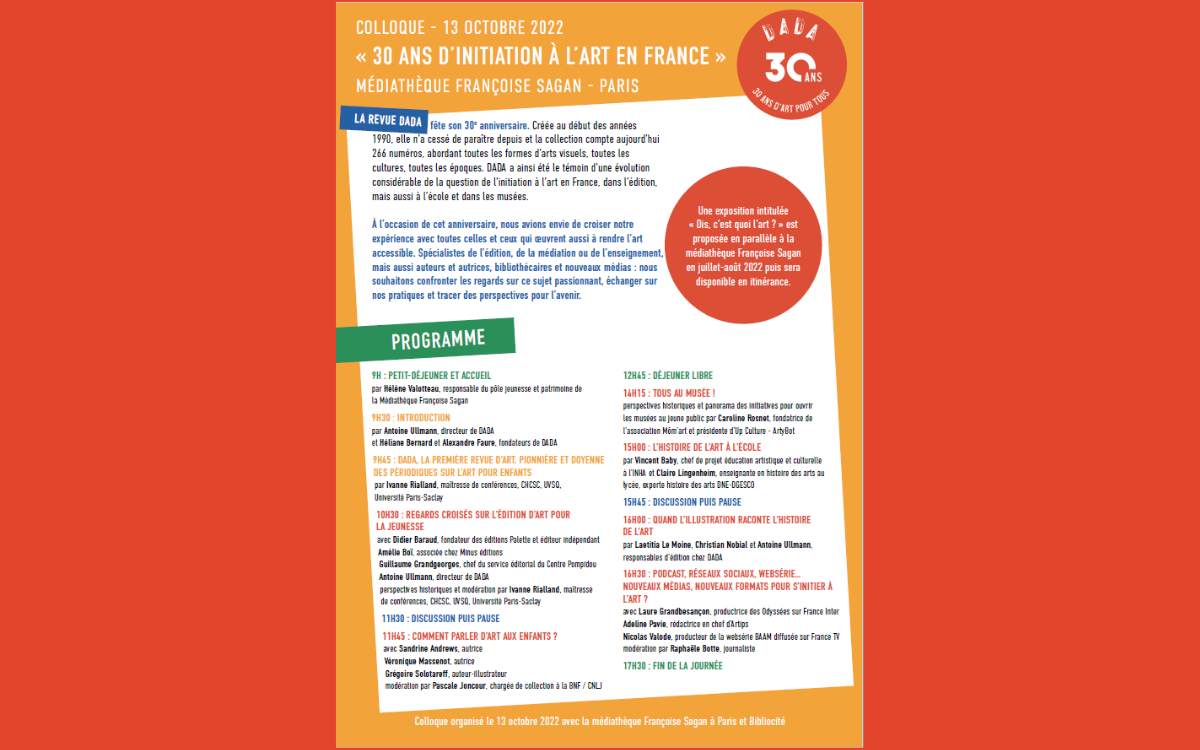 9h45 : DADA, la première revue d'art. Pionnière et doyenne des périodiques sur l'art pour enfants par Ivanne Rialland, maîtresse de conférences, CHCSC, UVSQ, Université Paris-Saclay