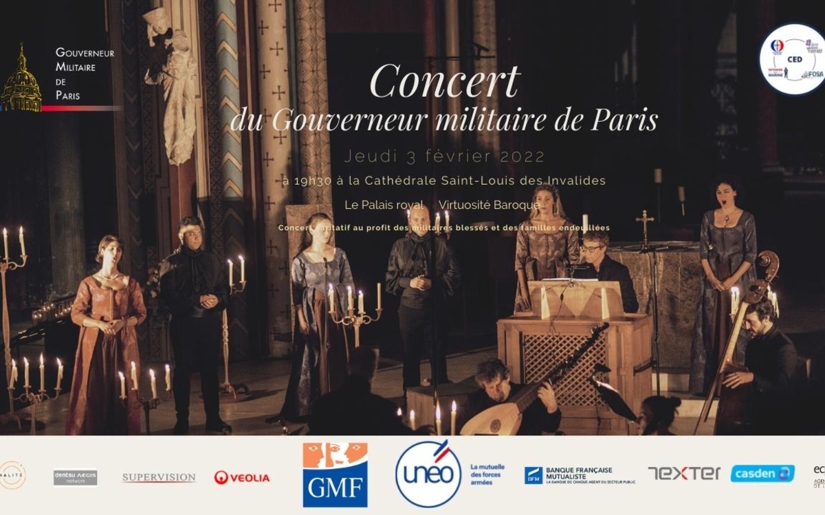 Comme chaque année, le gouverneur militaire de Paris organise un concert caritatif au profit des soldats blessés et des familles endeuillées. Cette année, ce concert caritatif est organisé le jeudi 3 février à 19h30 en la cathédrale Saint-Louis des Invalides, avec l'orchestre Le Palais royal qui interprètera un programme intitulé "virtuosité baroque". L'ensemble des dons sera reversé au Comité de l'entraide défense.