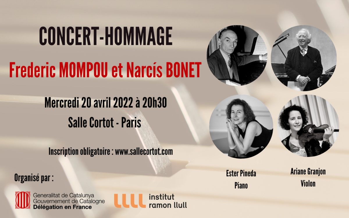 La Délégation du Gouvernement de Catalogne en France a l’honneur de vous inviter au concert-hommage consacré aux compositeurs catalans Frederic Mompou et Narcís Bonet. Les œuvres seront interprétées par la pianiste Ester Pineda et la violoniste Ariane Granjon. En introduction du concert, la soprano Hélène Bonet-Giraudier, veuve de Narcís Bonet nous parlera des trajectoires des deux compositeurs catalans.