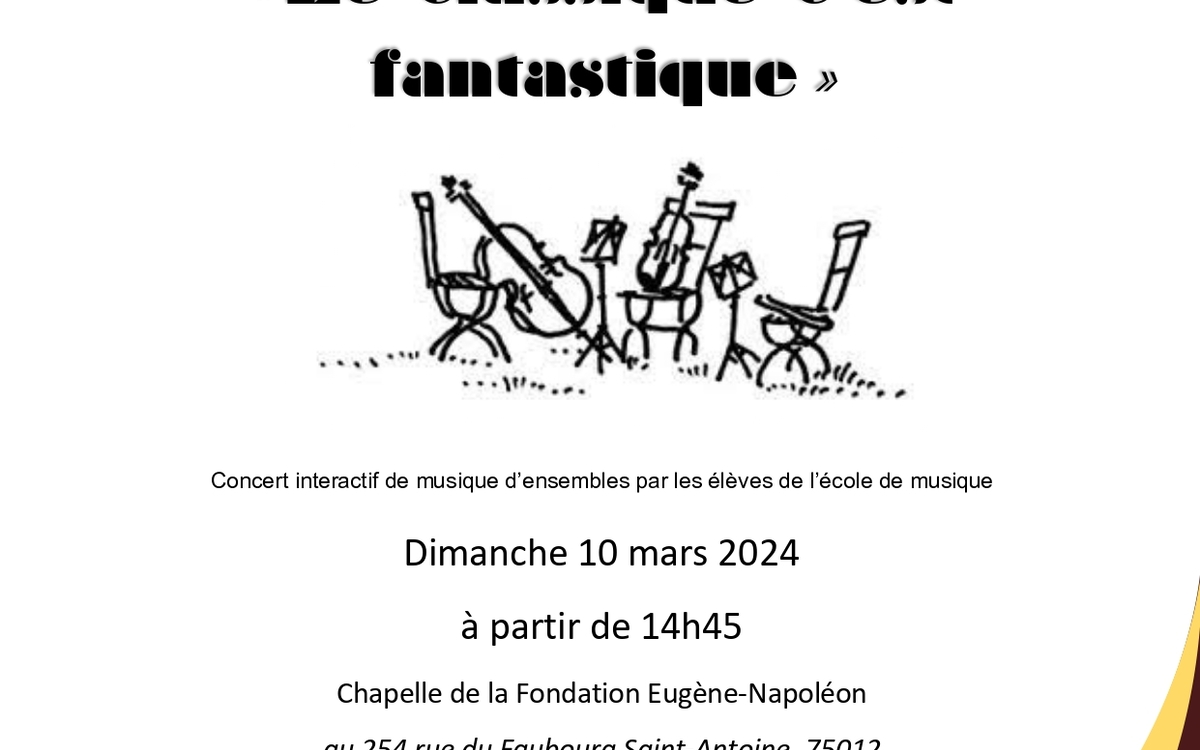 Les concerts participatifs ''Le Classique c'est fantastique !'', soutenus par la mairie du 12e, ouvrent un réel échange entre nos élèves musiciens de tout âge et les spectateurs invités en leur faisant découvrir leur passion. En effet, accompagnés par leurs enseignants, ils conduisent des essais de leurs instruments pour mieux les découvrir et se familiariser avec. L'objectif principal est de faire découvrir un répertoire varié, proposé par les élèves mais également d'engager une vaste ambition de conduire la musique auprès de tous, de faire découvrir les différents instruments à nos publics invités et de favoriser la spontanéité des échanges grâce à l’interaction directe entre les musiciens et les spectateurs.