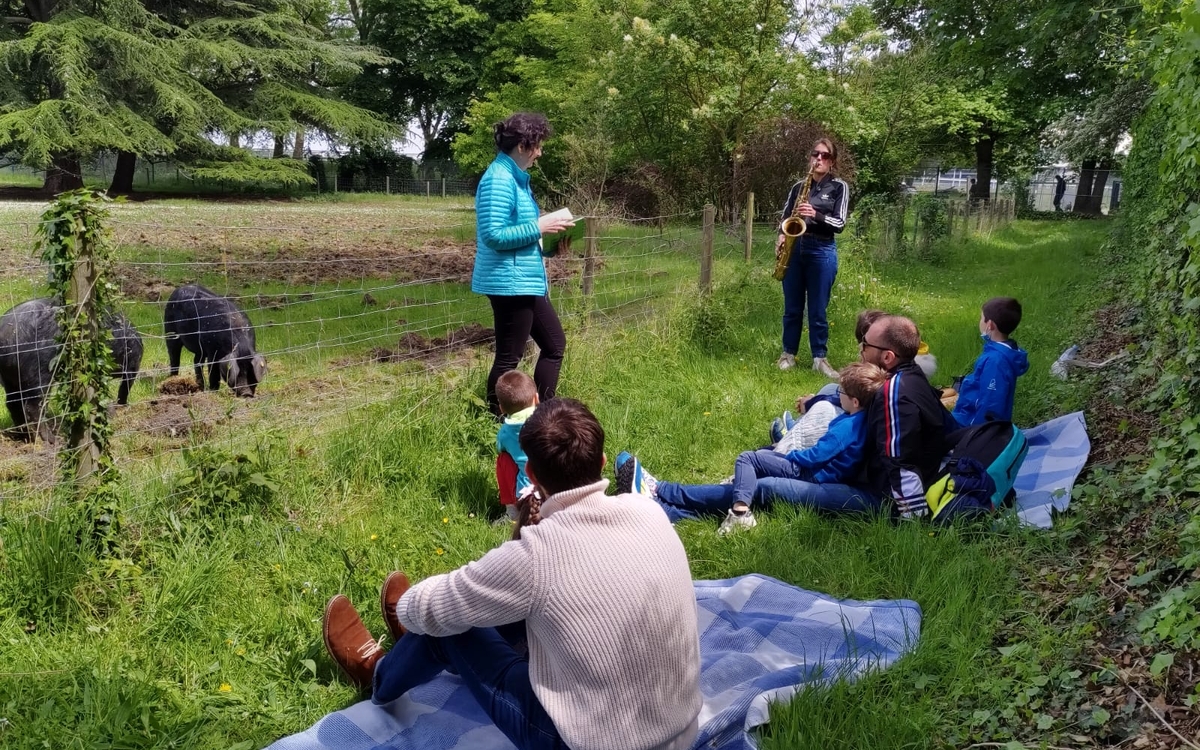 Fermier, musiciennes, et conteuse, s’associent pour emmener les enfants auprès des animaux et des espaces de la ferme.