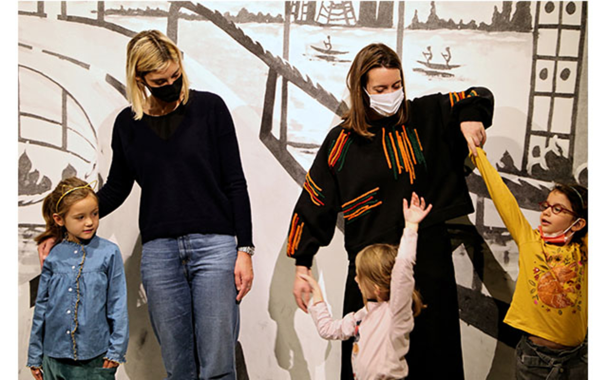 Cette introduction invite les participants au mouvement dans une mise en danse collective, de manière à rendre les corps et les esprits ouverts au caractère immersif de la visite. L’artiste propose ensuite au groupe une série d’improvisations guidées et différents jeux dansés, donnant aux parents et à leurs enfants l’occasion de partager un moment unique.