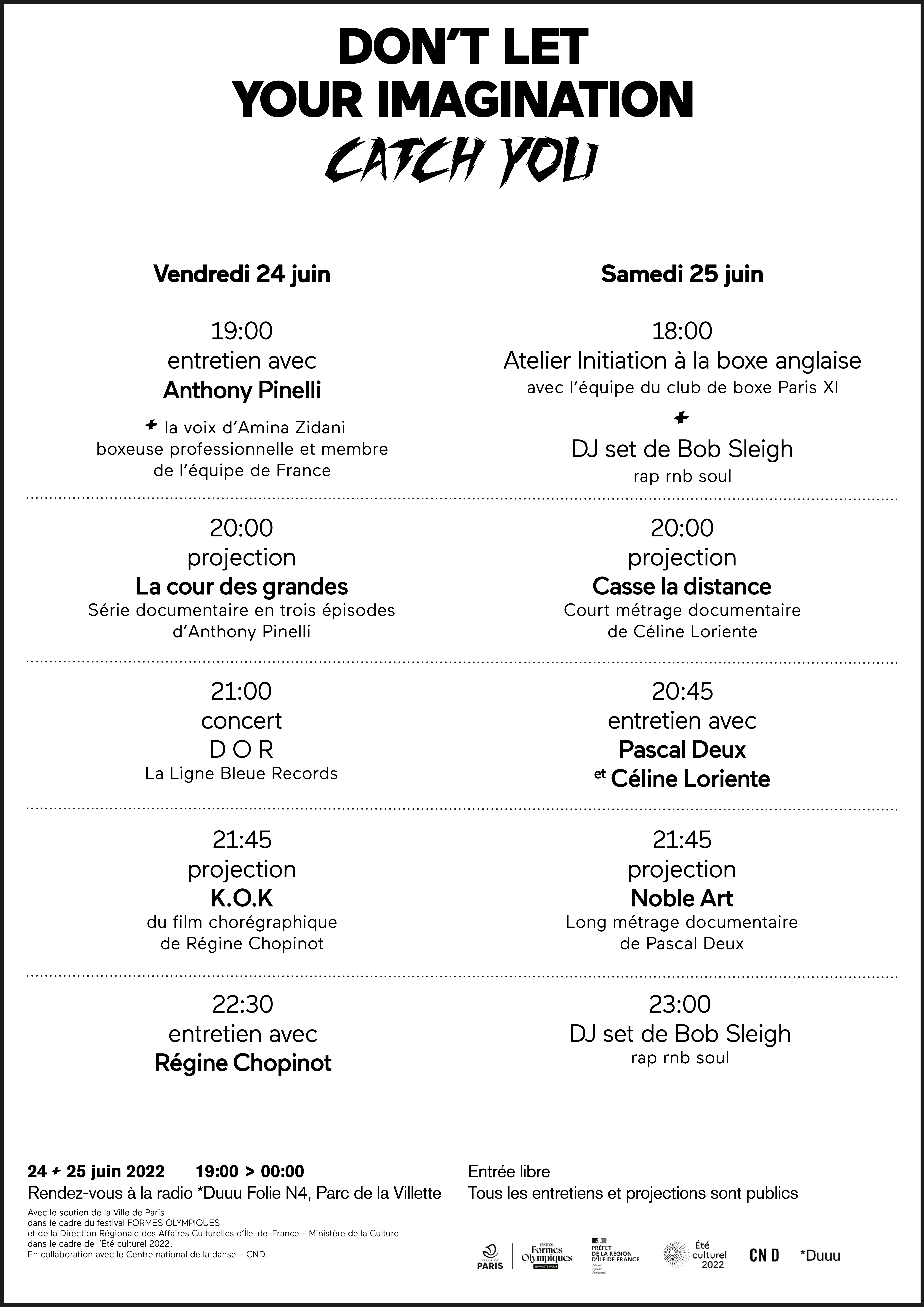 « Don’t let your imagination catch you » prononce d’une voix réconfortante le soigneur de Mike Tyson, Teddy Atlas, lorsqu’avant de monter sur le ring, le boxeur qu’on surnomme Kid Dynamite, s’effondre en larmes, pris par la peur. Ce jour-là, comme presque tous les autres, il gagnera son combat. Ce programme réunit 4 films (pièce chorégraphique, série, longs et courts métrages documentaires), dont la rencontre naît d’un thème commun et transversal, celui d’un sport de combat : la boxe anglaise. La pratique professionnelle et amateur, la résignation ou la résilience, la motivation inconditionnelle, le collectif, la chorégraphie, la colère, l’apprentissage et la rigueur arpentent les contours de ce sport davantage associé à la violence physique qu’à son caractère esthétique et bienfaiteur.