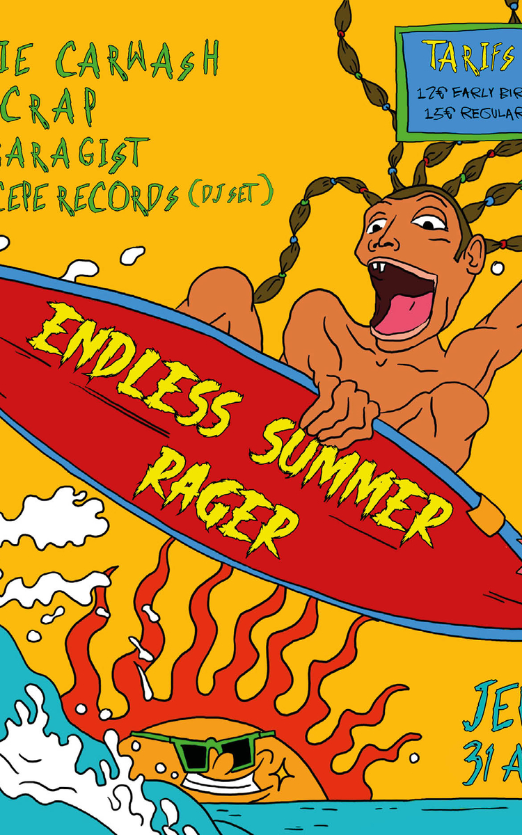 On vous donne rendez-vous pour une soirée tonitruante avec les Johnnie Carwash, DYE CRAP et Tony Garagist (Le Cèpe Records). Alors attendez un peu avant de ranger vos planches de surf, enfilez vos t-shirts déchirés et on se voit le 31 août !