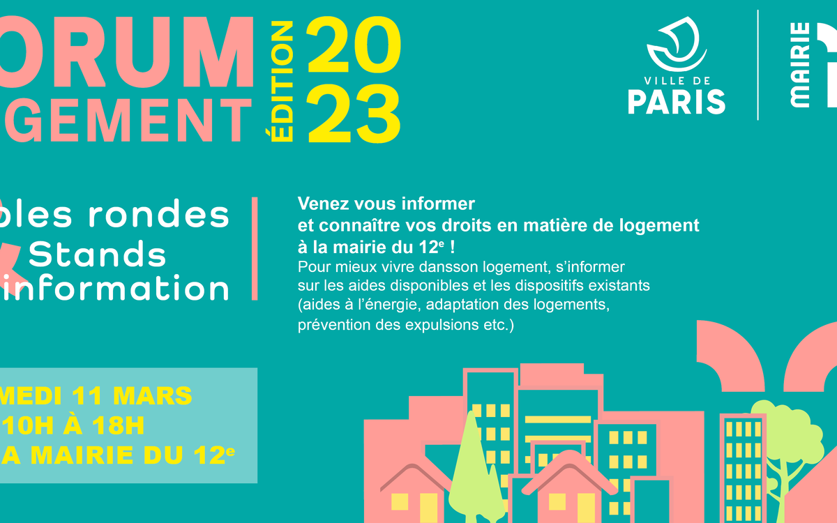 La Mairie du 12e organise le premier forum logement de la mandature le samedi 11 mars 2023 de 10h à 18h en salle des fêtes. Tables rondes, stands d'information, venez vous informer et découvrir les aides disponibles et les dispositifs existants, pour mieux connaître vos droits en matière de logement.