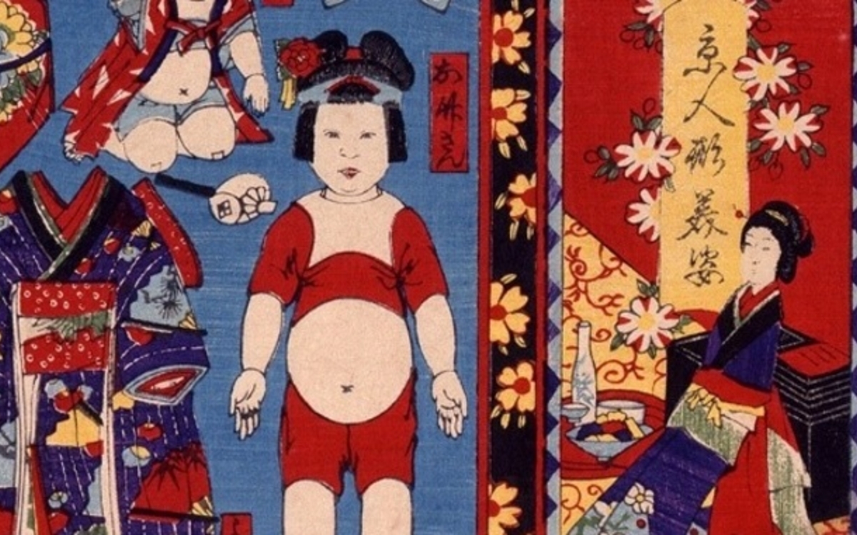 Nées au cours de l’époque Edo (1603-1868), les « images-jouets » connaissent un regain d’intérêt lors de l’ère Meiji. Bon marché et faciles à se procurer, elles sont très appréciées des enfants des classes populaires. Poupées à habiller, cerfs-volants ou planches de constructions à assembler… des illustrations aux couleurs vives qui sont non sans rappeler les images d’Épinal.