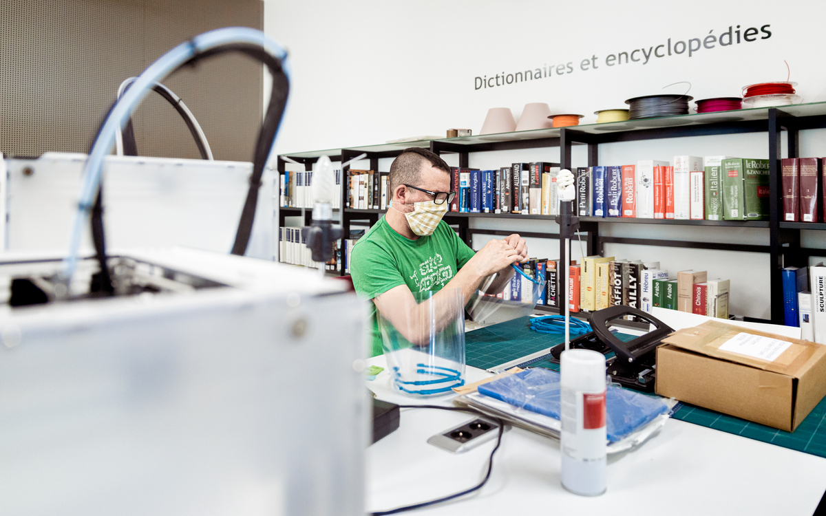 Quentin Chevrier, photographe indépendant proche du milieu makers, s’est porté volontaire début avril 2020 auprès de Volumes pour aider à la fabrication de matériel de protection. Après quelques jours d’assemblage de visières, se rendant compte que personne ne documentait visuellement cette initiative d’ampleur, il se fait remplacer chez Volumes par quelques amis et part en reportage. Des ateliers mobilisés aux hôpitaux dans le besoin, en passant par les bénévoles confinés et les livreurs à vélo, il couvre une grande partie de cet élan de solidarité en un mois et demi.