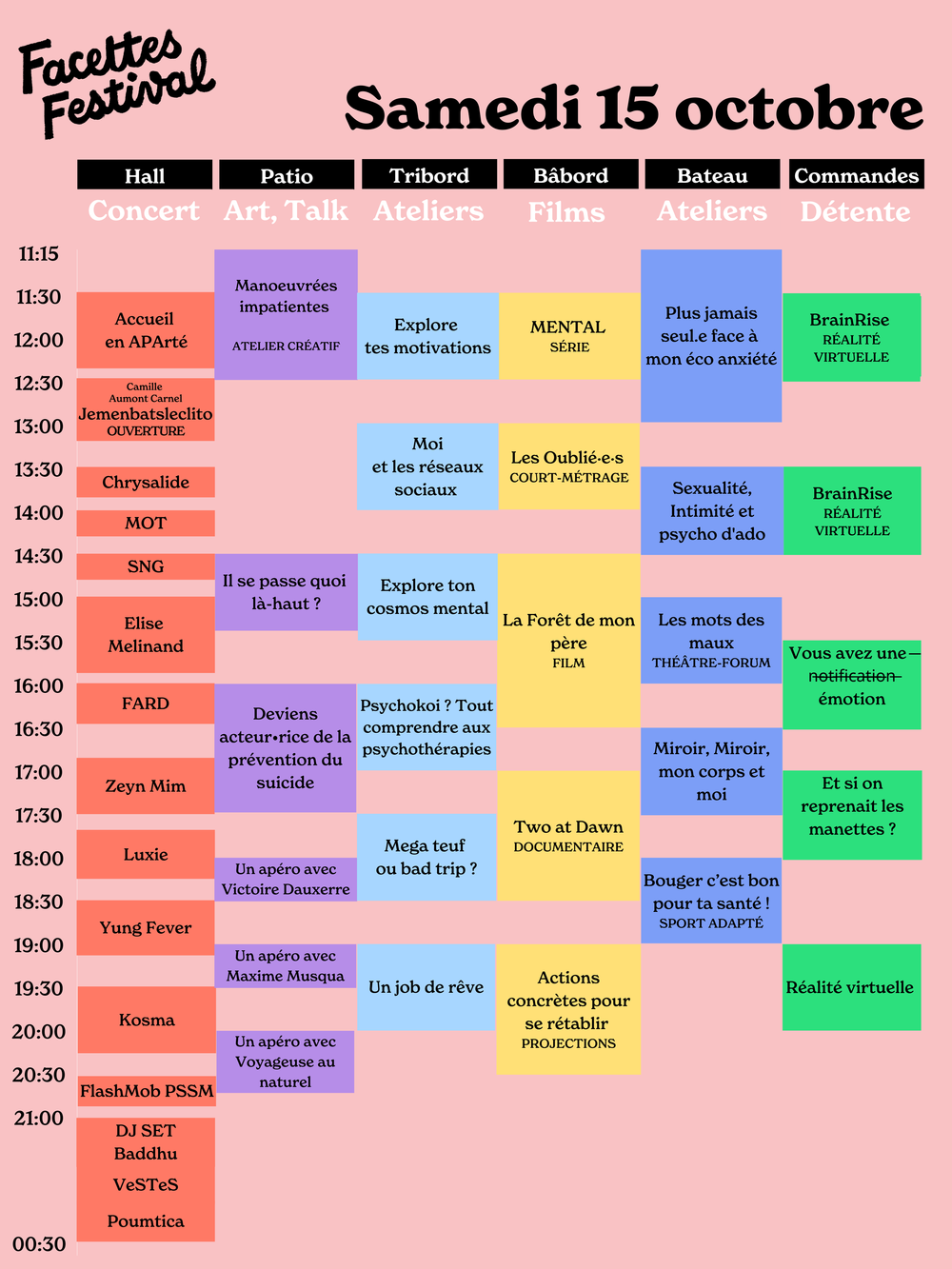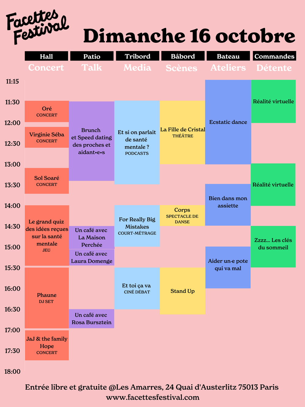 Facettes Festival débarque aux Amarres les 15 et 16 octobre 2022 pour une édition inédite, riche en découvertes et en rencontres. Concerts, stand-up, rencontres avec des influenceurs•ses, projections de films, ateliers, clubbing en accès libre et gratuit pour que chacun•e soit libre d’explorer la/sa santé mentale, le tout dans une ambiance festive et bienveillante.