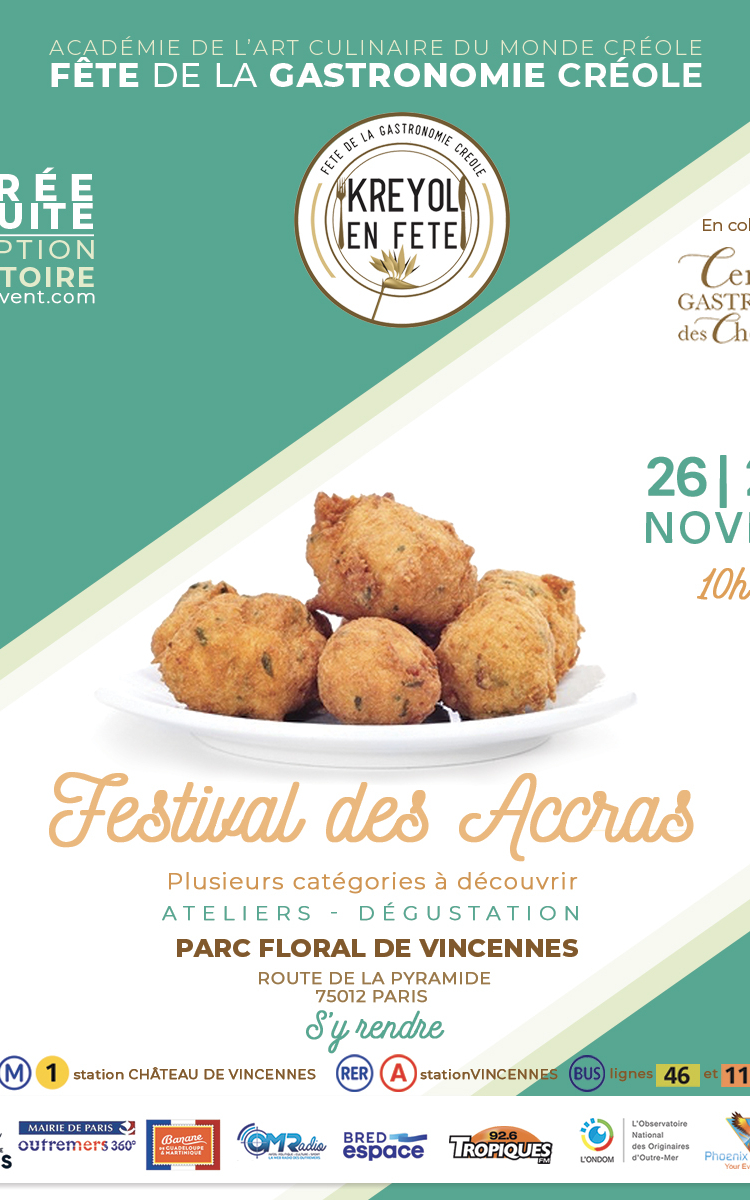 L’Académie de l’Art Culinaire créole présente la 5ème édition de « Kréyol en fête ». Une manifestation destinée à promouvoir et à valoriser la gastronomie créole qui se déroulera les 26, 27, 28 novembre prochains au Parc Floral de Vincennes avec pour thème « le Festival des accras ». L’occasion à la fois de déguster un met traditionnel très apprécié aux Antilles-Guyane et d’échanger avec des professionnels des métiers de bouche dans une ambiance conviviale.