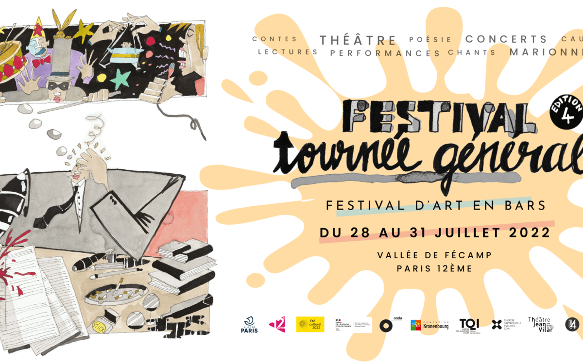 L’édition 4 du festival « Tournée Générale », festival d'arts en bar a lieu du 28 au 31 juillet 2022. Cela se passe dans la Vallée de Fécamp dans le 12ème, dans les 4 bars partenaires : Le Satellite, Au Bon Coin, Le Pays de Vannes, Le Disque Bleu. Avec 15 propositions, dont quatre créations produites par « Tournée Générale », deux premières nationales, une carte blanche, et un total de 20 représentations, « Tournée Générale » tape fort pour le 4ème coup.