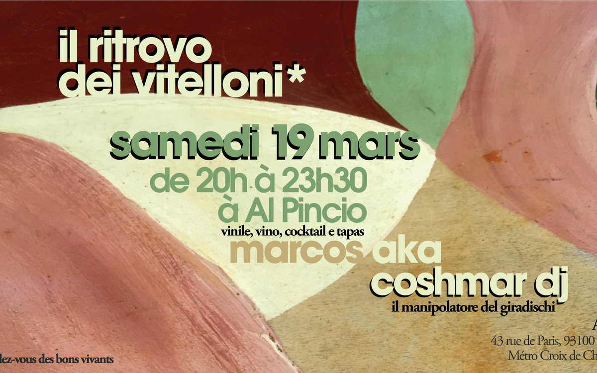 Marcos aka Coshmar Dj, le fondateur de Star Wax mag, vous invite à débuter la soirée, de 20h à 23h30, samedi 19 mars chez Al Pincio, l'unique bar tapas de Montreuil avec un Dj Booth et un magnifique patio pour fumer ta mèche.