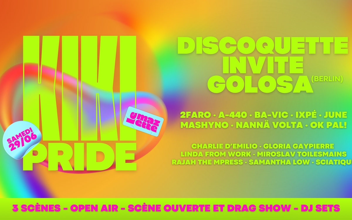 Discoquette s’associe cette année avec Golosa pour sa désormais traditionnelle Kiki Pride au Mazette ! Le collectif queer berlinois a su s’imposer en quelques années comme l’une des soirées incontournables de la capitale germanique (avec des passages remarqués au Whole Festival notamment) mettant l’accent sur des line-ups exigeants et sur la diversité de son public.