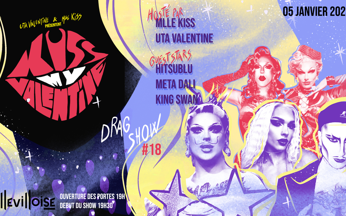 Retrouvez lors de cette édition mensuelle le 05 Janvier 2024 pour célébrer l’art drag, l’amour et l’humour , Mademoiselle Kiss et Uta Valentine. Elles vous réservent un show placé sous le signe de l’amour et du glamour accompagnées par la mystérieuse créature , Hitsublu, la beauté enivrante Meta Dali, ainsi que le séduisant King Swan !
