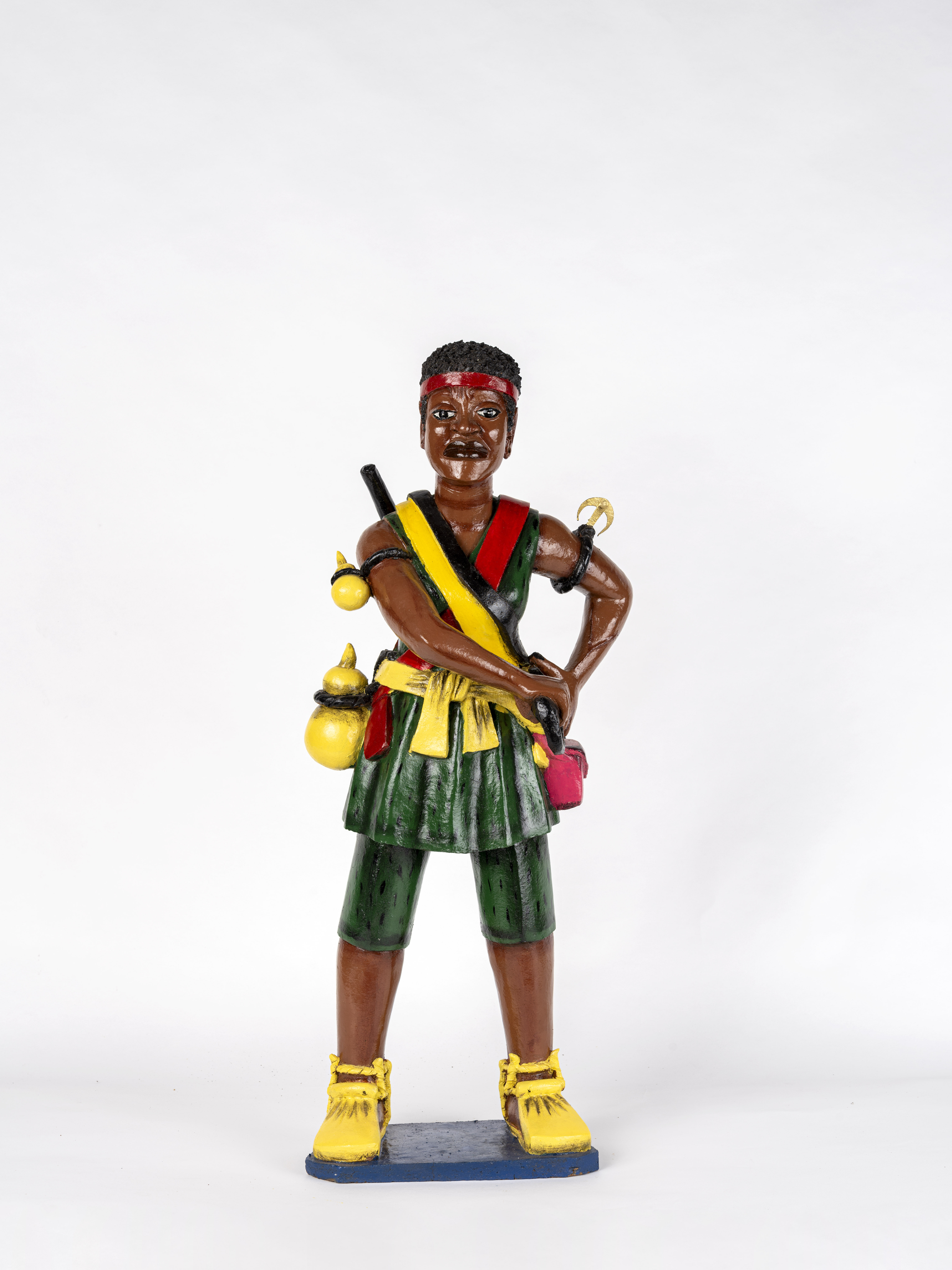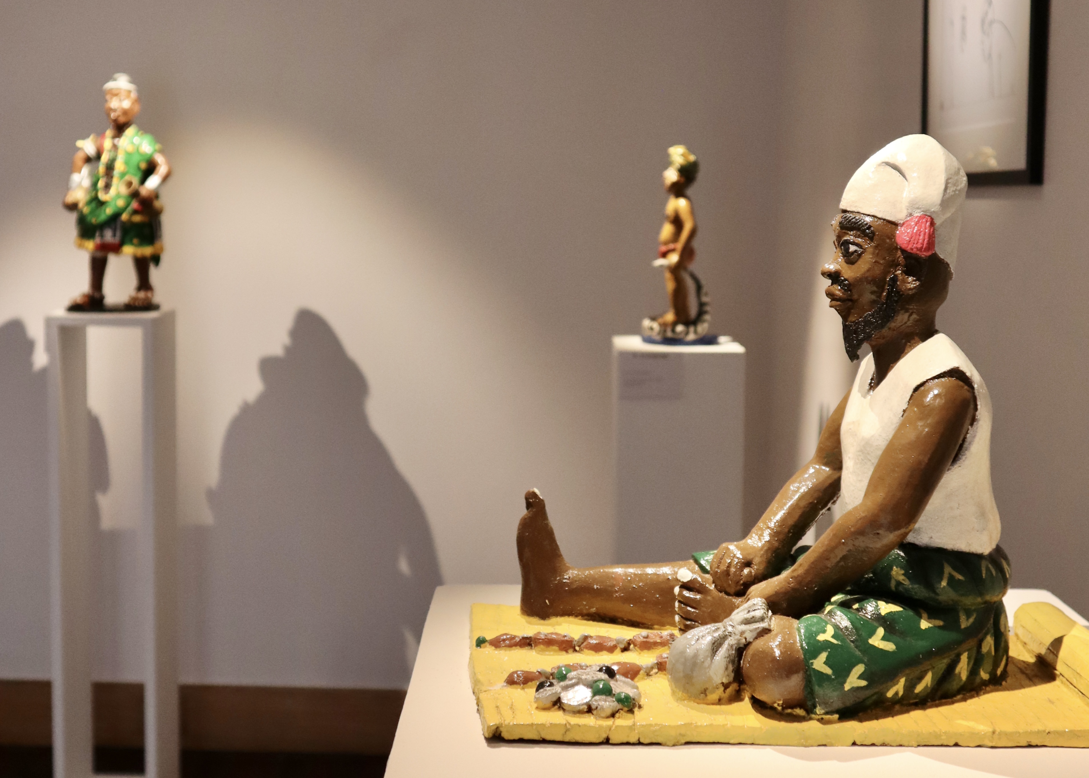 L’argile, qu’elle modèle, cuit et peint avec maîtrise, est son médium de prédilection. « Mes pièces parlent des rois et des guerriers de l’ancien Dahomey. Elles représentent les divinités, les dieux et les demi-dieux, et décrivent la vie sociale des habitants », explique l’artiste. Elle n’oublie pas les femmes – déesses, amazones, ou héroïnes du quotidien – qui sont bien présentes dans son panthéon.