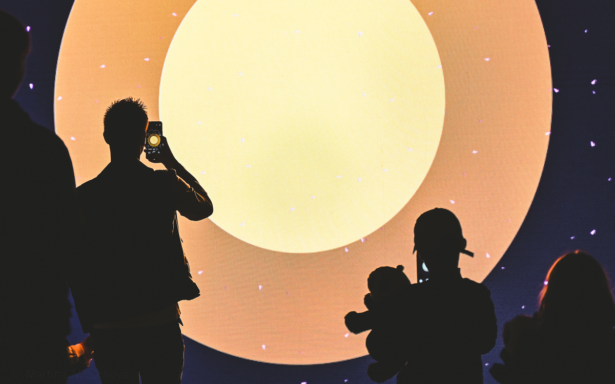 Les artistes slovaques Dominika Žáková, Veronika Zúbek Kocourková, Jonatán Pastirčák (Pjoni) élaborent une comète audiovisuelle qui émerge de l'horizon en musique.