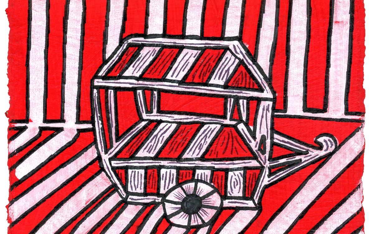 Pour Nuit Blanche, le 87, rue Marcadet se pare de rouge et blanc : art-exprim invite l'artiste Clément Courgeon à prendre possession de son espace d'exposition pour une proposition inédite et folklorique intitulée « La chariotte du malin ».