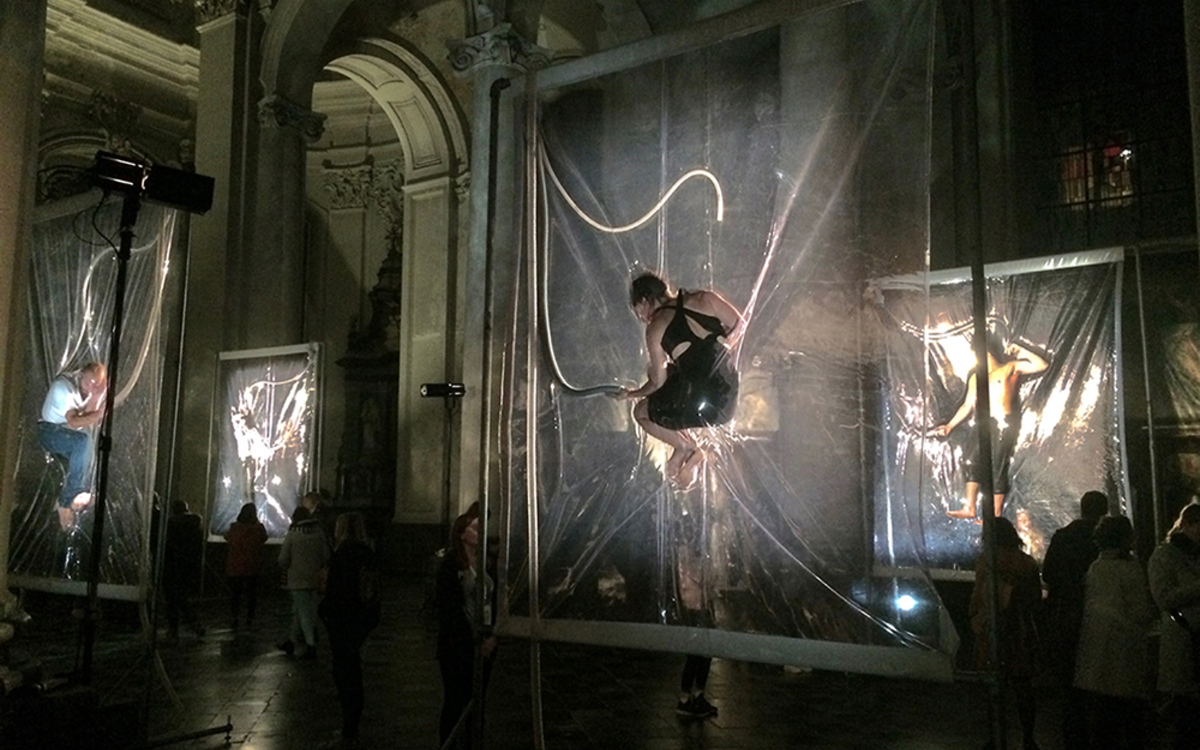 Peu à peu, la pression de l’air fige les corps emballés et en limite leurs mouvements. Telle une chrysalide, les performeurs se meuvent dans une extrême lenteur et changent délicatement de position, allant d’une posture embryonnaire à celle d’un corps crucifié. Ils sont à l'image de notre monde en pleine mutation et dans lequel l’humain cherche perpétuellement à subtilement s’adapter.