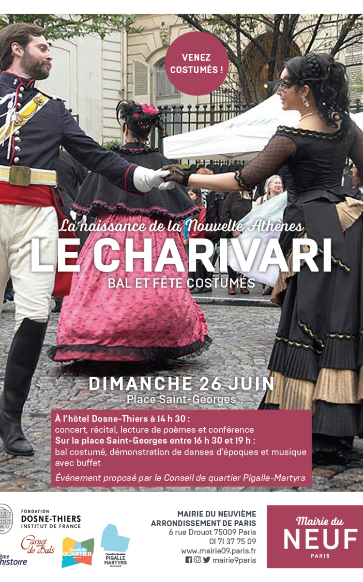 Après avoir fêté le caricaturiste Gavarni (2016), la mode et la gastronomie du XIXe (2017), les petits métiers disparus (2018) puis le bicentenaire de la naissance de Jacques Offenbach (2019), le Conseil de Quartier Pigalle-Martyrs, soutenu par la Mairie du 9e, a choisi pour relancer le « Charivari » le thème de la « Nouvelle Athènes ».