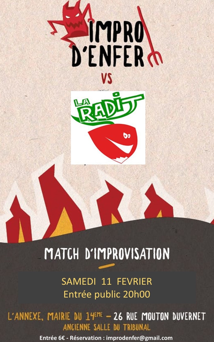 Un match d'improvisation de folie en perspective, Impro D'Enfer, fine troupe d'impro du 14e reçoit la Radit de Toulon pour un match endiablé!! Animé par notre maîtresse de cérémonie, mis en musique par notre musicien préféré et arbitré par un terrible arbitre, les deux équipes n'ont qu'à bien se tenir, pour le plus grand plaisir du public!