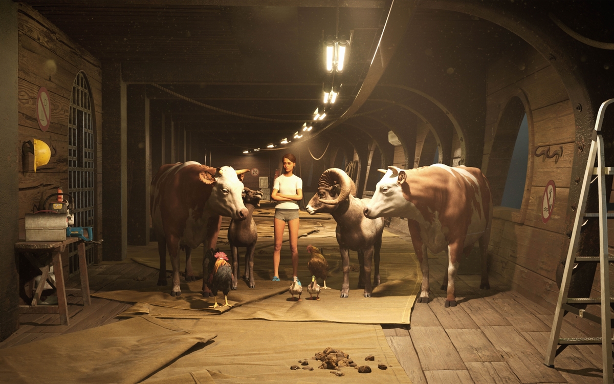 L’hypothèse de l’artiste est la suivante : l’arche de Noé, dernier refuge de l’humanité et du règne animal avant le grand Déluge, n’est qu’un chantier d’insertion, où des rescapés sans repère sont venus chercher le moyen de se sentir enfin « productifs, utiles, rentables ». Mais quelle issue espérer lorsque la seule mission qui vous est confiée est d’empiler des briques ? Et surtout comment se termine l’histoire de ces rescapés de l’arche une fois sur la terre ferme ?