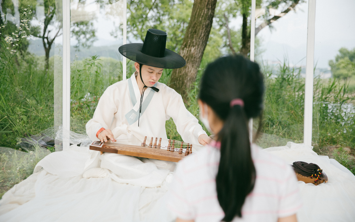 Namureyoung est un groupe coréen proposant un concert intimiste au cours duquel les musiciens jouent à tour de rôle dans un cadre singulier situé en pleine nature. S’inspirant de pratiques anciennes, où les musiciens jouaient pour une seule personne en face à face, ce dispositif crée une oasis de calme permettant une connexion optimale entre l’interprète, l’auditeur et la nature environnante. Il rappelle le sarangbang, espace situé à l’entrée des maisons traditionnelles et utilisé pour l’écriture, les rencontres ou les loisirs. Par le jeu du haegeum (violon), du gayageum (cithare), du daegeum (flûte traversière) ou du jeong-ga (chant poétique), Namureyoung évoque cette ambiance et cette histoire puissantes dans un espace conçu pour concentrer l’expérience du temps et de l’espace par la résonance et la proximité du son, rendant cette rencontre musicale unique.