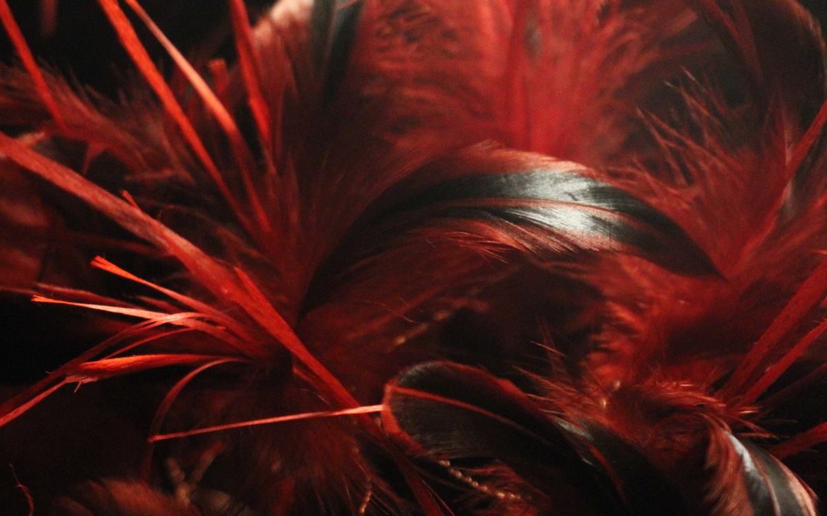 feathers she deconstructs into a fine stole of red rooster and green duck