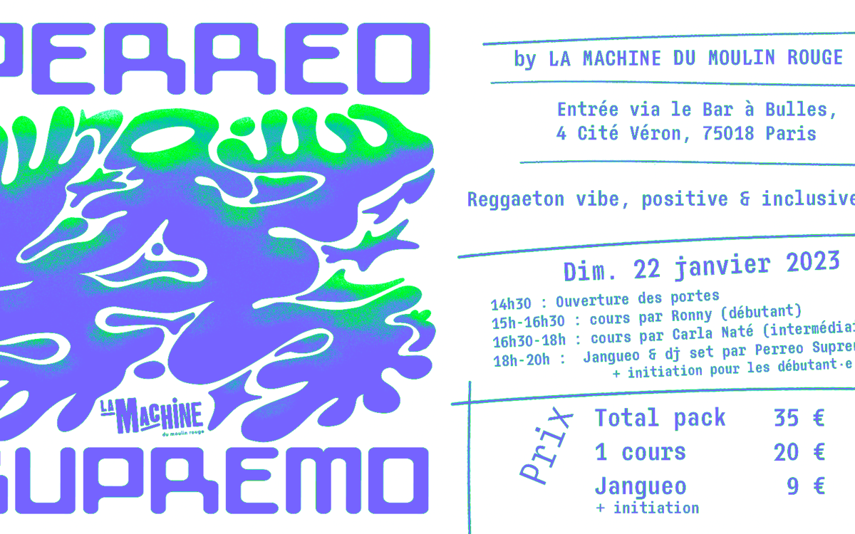 On te donne rendez-vous le dimanche 22 janvier à La Machine du Moulin Rouge pour cette 4ème édition de Perreo Supremo. Au programme : 2 cours de danse Reggaeton suivis d’un Jangueo pour vibrer toustes ensemble ! Une ambiance club, un espace positif, inclusif et bienveillant à La Machine du Moulin Rouge.