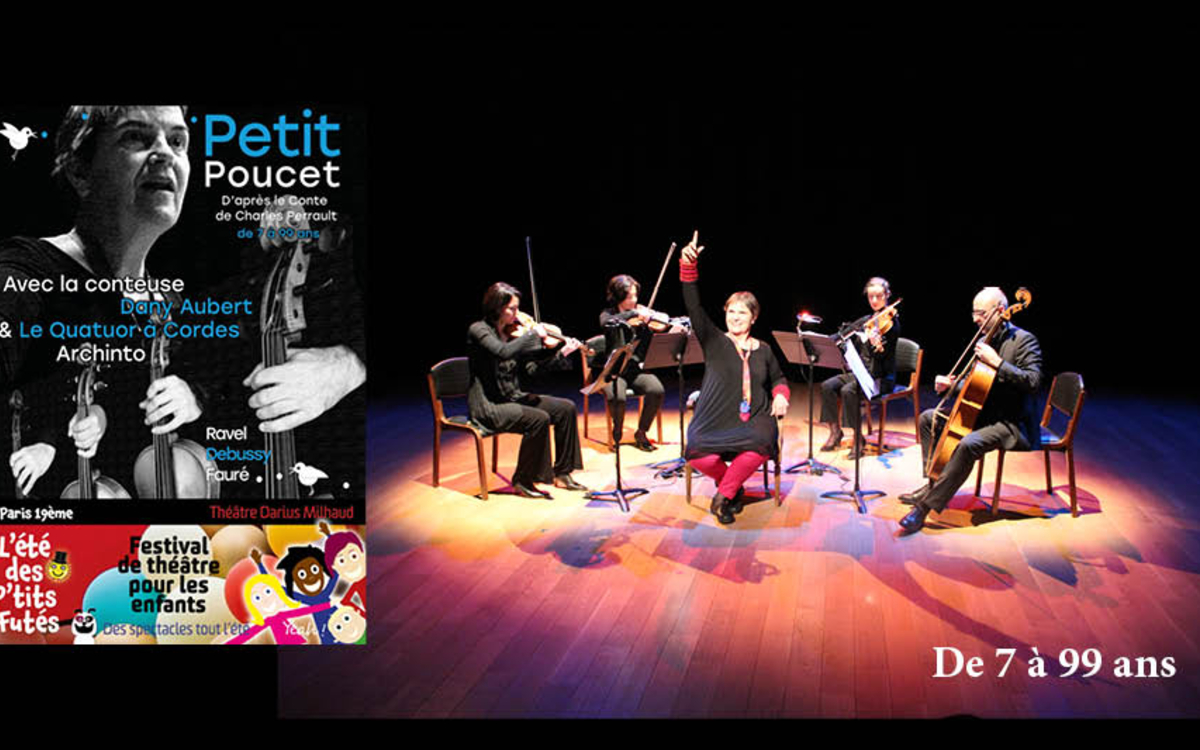 Le Petit Poucet raconté par Dany Aubert et le Quatuor à cordes Archinto. L’univers féérique du conte, à la fois raffiné et enfantin, vient se nicher au creux des notes et des mots.