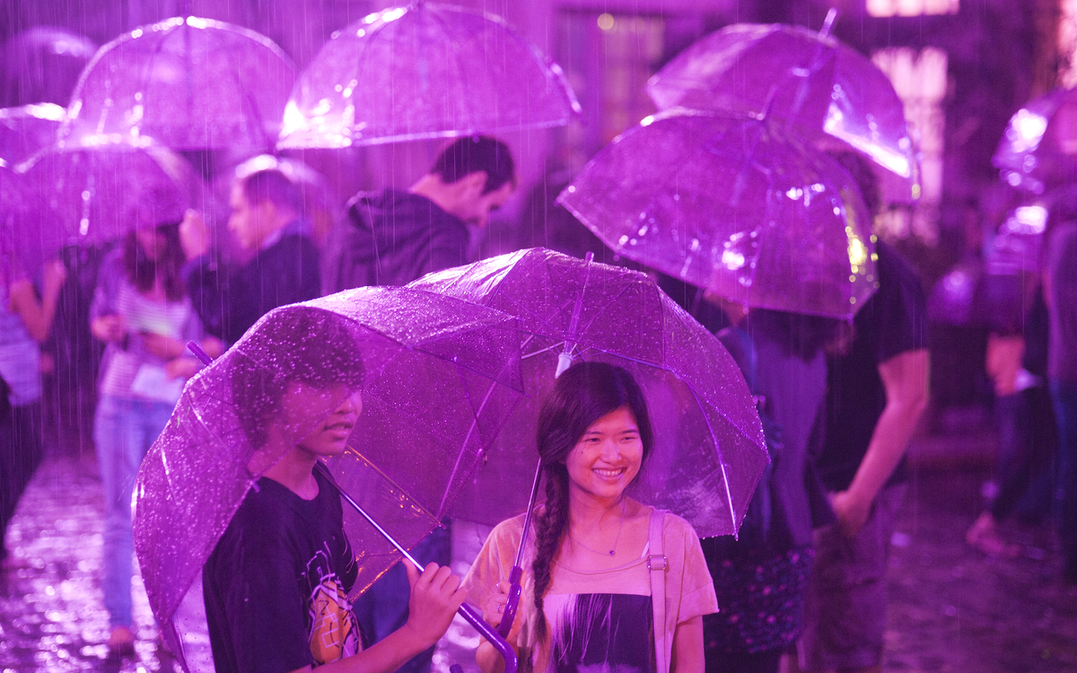 Installation immersive - Nommé d'après la célèbre chanson de Prince, Purple Rain active un environnement de pluie artificielle violette.