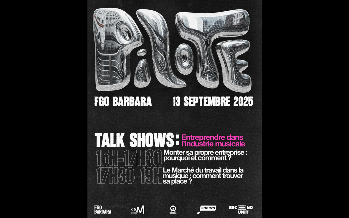 Présenté par le FGO-Barbara et Second Unit, les talks shows PILOTE sont dédiés à l’entreprenariat dans l’industrie musicale. Cet événement naît d’un constat : le manque de ressources, d’espace, de paroles dédiés à celles et ceux qui veulent apprendre et se connecter autour d’une ambition commune : se professionnaliser dans l’industrie musicale.