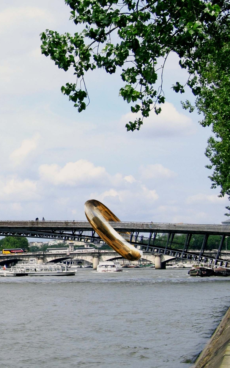 Avec RINGdeLUXE, c’est un anneau monumental en gonflable doré qui vient enserrer la passerelle Léopold-Sédar-Senghor. Cette alliance relie les deux rives autant qu’elle évoque la dimension inséparable de la ville et de son fleuve.