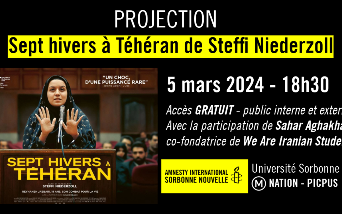 L’antenne jeunes d’Amnesty International France de l’université Sorbonne Nouvelle vous propose une projection gratuite de Sept hivers à Téhéran de Steffi Niederzoll.