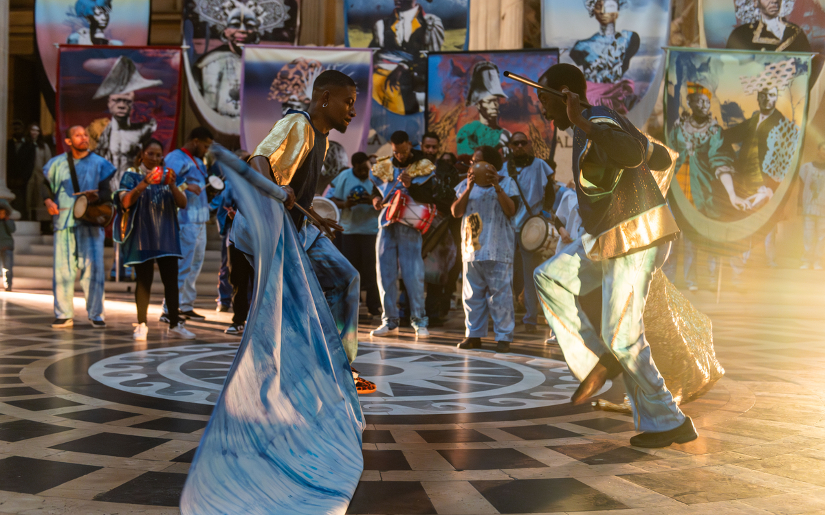 Mu par la puissance du mas, tradition carnavalesque militante de la Guadeloupe auquel le rythme accéléré donne des allures de marche militaire, Déboulé céleste est l’aboutissement de la réflexion de Raphaël Barontini sur la mise en mouvement de formes picturales monumentales au service du collectif. Avec Déboulé céleste, Barontini s’inscrit pleinement dans une esthétique afro-diasporique du mouvement collectif, dont son expérience a été récemment nourrie par les Second Lines et Black Indians de la Nouvelle-Orléans et librement inspirée du Hosay de Trinité-et-Tobago. Ainsi, le combat de la Lune et du Soleil au centre de ce rituel d’origine hindoue créolisé dans la Caraïbe, devient une battle entre deux groupes de mas : le groupe de tambours à peau Choukaj et le groupe à caisses claires Bully Mass. Le tout forme une performance processionnelle avec une aura afro-futuriste caribéenne servie par la dimension déambulatoire, et insulaire, de l’Allée des Cygnes, aussi connue sous le nom de l’Île aux Cygnes.