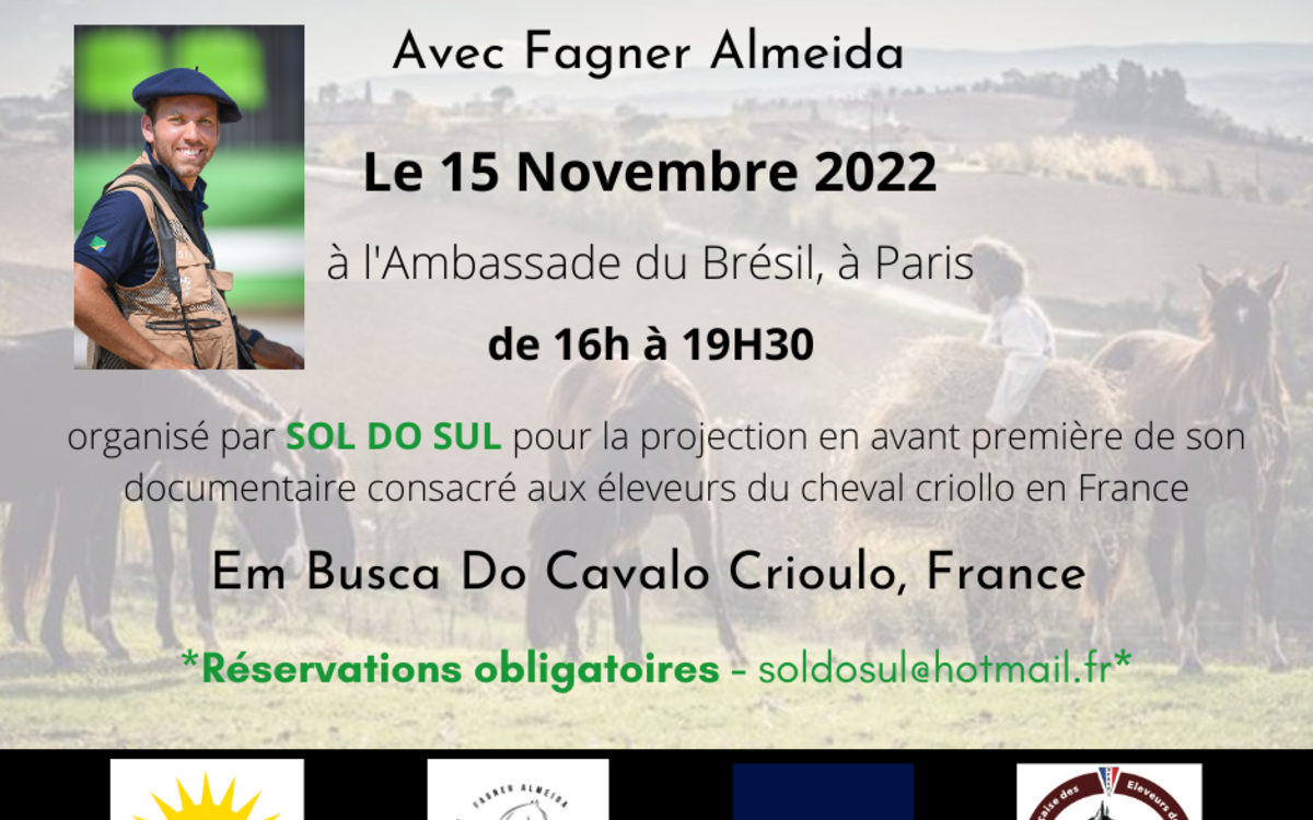 L’Association SOL DO SUL a le plaisir de vous inviter à une « Rencontre autour du Cheval Criollo » qui aura lieu le mardi 15 novembre 2022, de 16h à 19h30 à l’Ambassade du Brésil à Paris, à l’occasion de la projection en avant-première du documentaire du photographe brésilien Fagner Almeida : Em busca do Cavalo Crioulo ».