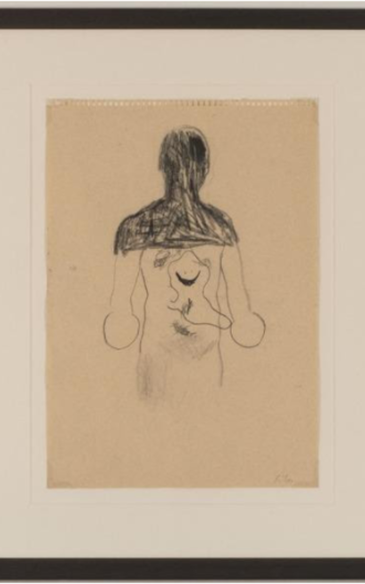 Les deux dessins exposés -le second intitulé Sans titre (crâne "sapin" aux trois boulles à la base- acquis en 2005 sont issus des carnets de l’artiste. L’un figure un crâne aux sourcils fournis surmontant un sapin foisonnant. Le deuxième représente un corps dont les bras se terminent par ce qui s’apparentent à des moignons, et dont une forme – organe méconnaissable – sort de son abdomen. Ces visions esthétiques très personnelles et poétiques sont créées par la psyché de l’artiste, révélant son désir lorsque les sens s’émoussent et partent à la dérive.